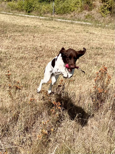 Die Süße hatte 8 Wurfgeschwister, doch leider hatte eines keinen Saugreflex und alle Bemühungen blieben erfolglos. So ist Ruby mit 7 weiteren Wurfgeschwistern, ihrer Mutter und zwei Rüden, allesamt Kleine Münsterländer, in den ersten Wochen ihres Lebens im schönen Altmühltal aufgewachsen.